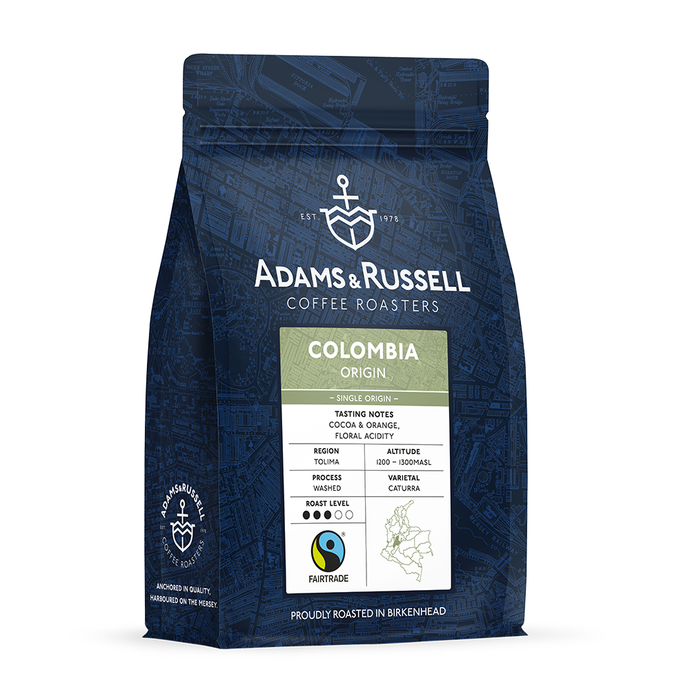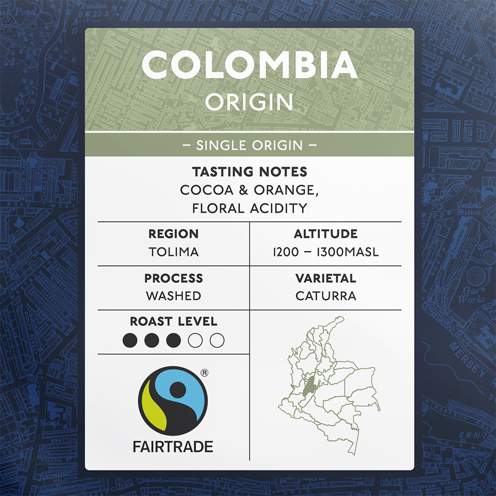Our Fairtrade Colombia Origin is sourced from multiple smallholders across the department of Tolima in the Andean Region. This prime location benefits from the perfect balance of dry spells and rainfall. Grown at high altitudes (1200 – 1300m average) the beans develop a complex and nuanced flavour. Fairtrade certified.