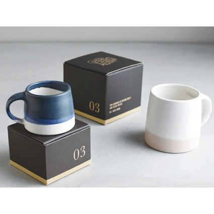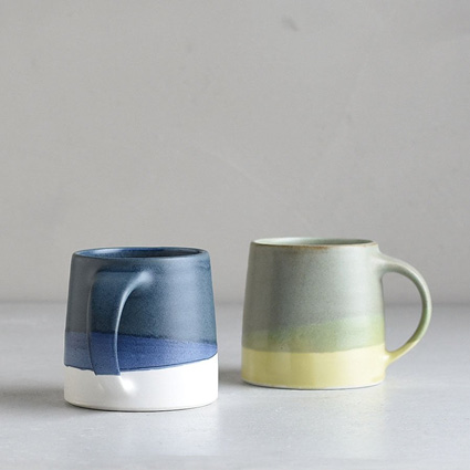Traces of handwork on the potter’s wheel and two colors of layered glaze bring about unique expressions of the mugs. The supple shape fits well inside your hands, and the wide arched handle that connects smoothly to the cup makes it comfortable to use.