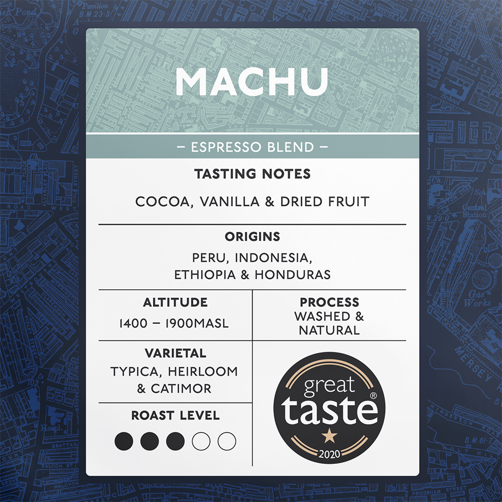 Machu Supreme blend consists of an array of high grade arabicas from around the world. Our beloved Peru Grade One is the heart and soul of this blend (hence ‘Machu’.) This medium roast blend has a light, citrusy character with notes of vanilla coming through at the end.